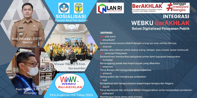 TNO, LUWU – Pemerintah Kabupaten Luwu melalui Dinas Pendidikan mendukung dan mengapresiasi Literasi Digital dan Digitalisasi Pelayanan Publik yang digagas oleh, Kepala Bidang Pembinaan SD Dinas Pendidikan Kab. Luwu PADRI PADELANG NOOR, S.Pd., M.Pd, yakni, “INTEGRASI WEBKU BerAKHLAK, Solusi Digitalisasi Pelayanan Publik” yang dituangkan dalam kegiatan Sosialisasi Inovasi Aksi Perubahan.