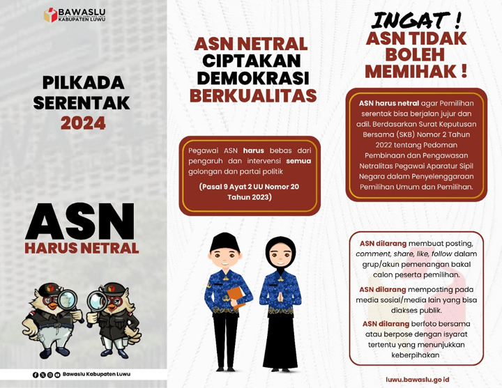 Wahyu Derajat, selaku Koordinator Divisi Hukum, Pencegahan, Parmas dan Humas Bawaslu kabupaten Luwu berharap kepada Pegawai ASN/PNS dan Kepala Desa serta aparat Desa sebisa mungkin untuk menahan diri dalam membuat keputusan dan/tindakan yang dapat dimaknai menguntungkan atau merugikan pasangan calon tertentu, baik itu secara langsung maupun melalui Sosial Media. Khususnya pada saat pelaksanaan pencabutan nomor urut pasangan calon yang digelar pada Senin 23 September 2024.