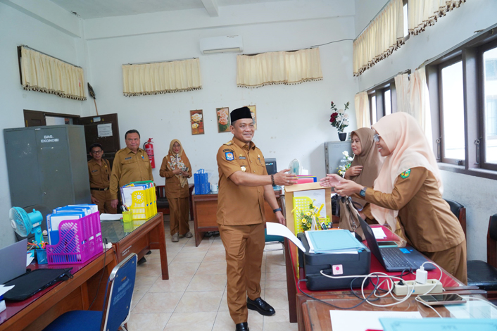 Selain kehadiran dan aktivitas pegawai, Bupati juga mengamati kondisi fasilitas kerja, serta kebersihan lingkungan kantor sembari menyapa para pegawai dan menanyakan tugas-tugas mereka.