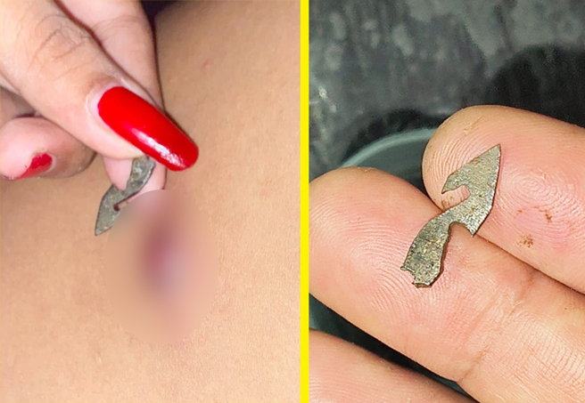 Betapa terkejutnya mereka ketika dari luka tersebut keluar darah hitam disertai potongan benda tajam yang diduga mata busur dengan panjang kurang lebih tiga (3) sentimeter.