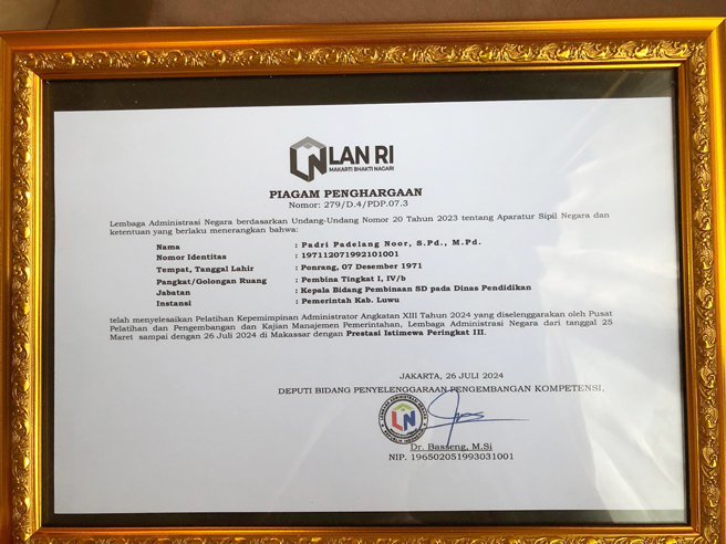 Dalam Pelatihan Kepemimpinan Administrator (PKA) Angkatan XIII Tahun 2024 tersebut, Kepala Bidang Pembinaan SD Dinas Pendidikan Kab. Luwu, PADRI PADELANG NOOR, S.PD. M.PD mengumpulkan 4 Piagam Penghargaan Special yaitu :
