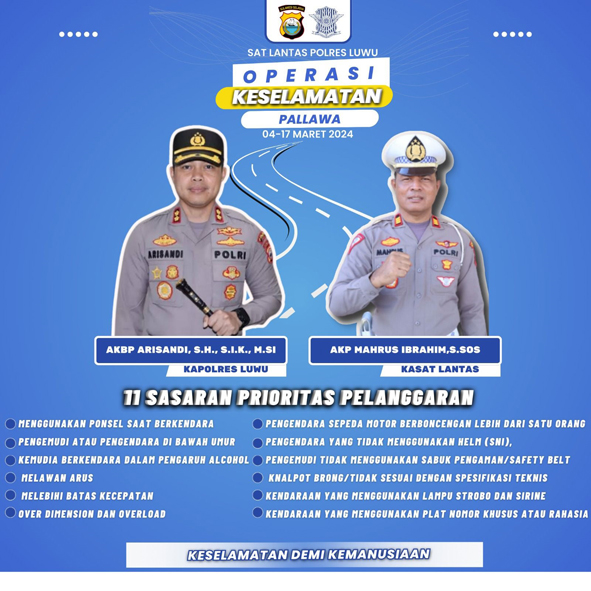 TNO, LUWU SULSEL – Satuan Lalu Lintas (Satlantas) Polres Luwu jajaran Polda Sulsel akan menggelar Operasi Keselamatan Pallawa yang dilaksanakan serentak di seluruh Indonesia mulai 4-17 Maret 2024.