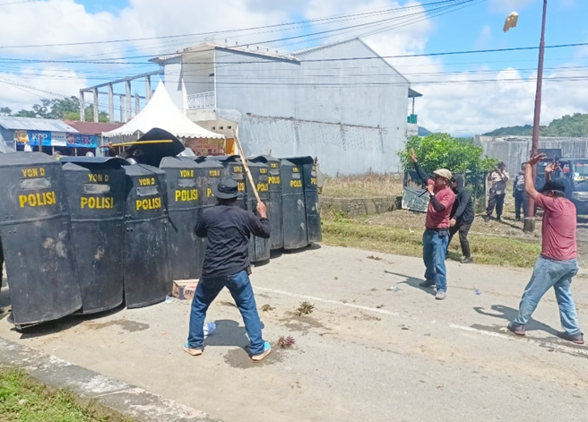 Namun sayang, massa yang sudah mulai tersulut emosi malah kembali menyerang petugas Pengamanan dengan cara melempari pasukan dengan botol air mineral. Situasi pun kian tidak kondusif saat sebagian massa mulai melakukan penjarahan hingga petugas kepolisian dari Polres Luwu mengambil tindakan tegas dan terukur, dengan cara memukul mundur massa menggunakan pasukan tambahan dari BKO Satbrimob Batalion D Polda Sulawesi Selatan yang disiagakan.