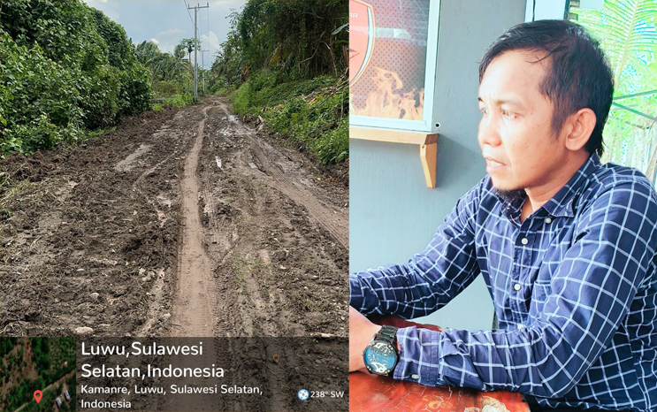 Infrastruktur jalan di Desa Wara, Kec. Kamanre yang lumpuh akibat dipenuhi lumpur. Tampak Dheden Marahuni saat ditemui Teropongnews di Belopa, Kamis (16/05/2024).