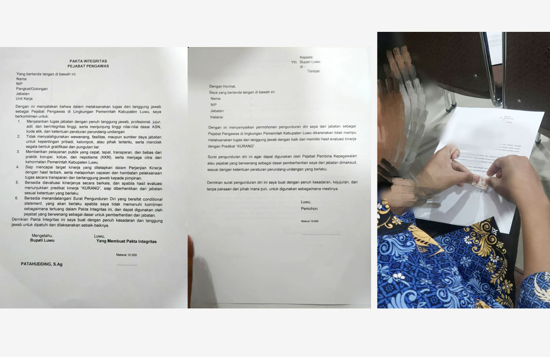 Namun, berdasarkan keterangan sumber yang dihimpun Teropongnews-online, seluruh pejabat yang dilantik disebut telah diminta menandatangani Surat Pernyataan Pengunduran Diri tanpa tanggal (tanggal dikosongkan) sebelum acara dimulai. Dokumen tersebut dibagikan panitia di ruang pelantikan dan wajib ditandatangani di atas meterai Rp10.000.