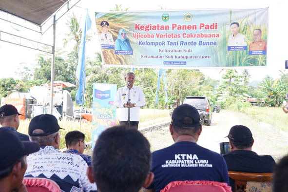 TNO, SULI LUWU – Bupati Luwu, Dr. Drs. Basmin Mattayang, M.Pd, melakukan panen perdana padi ujicoba Varietas Cakrabuana kelompok Tani Rante Bunne Kelurahan Suli, Kecamatan Suli, Kamis 18 Januari 2024.