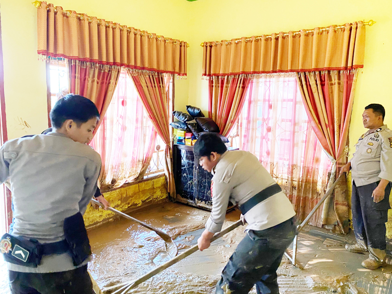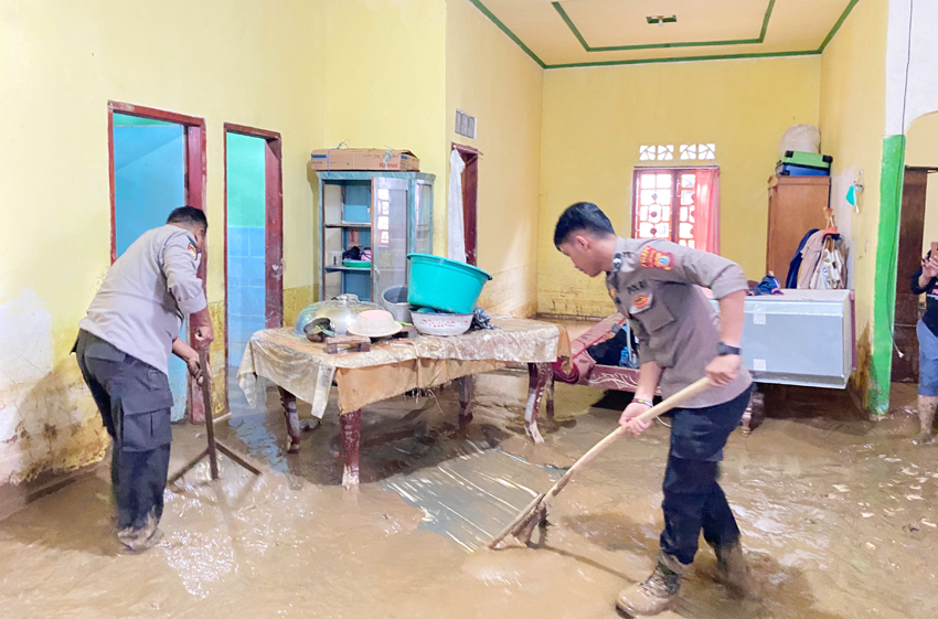 TNO, BELOPA LUWU – Polisi bantu bersihkan rumah warga terdampak banjir di Luwu, tak ketinggalan, Bhayangkari juga bagi bantuan.