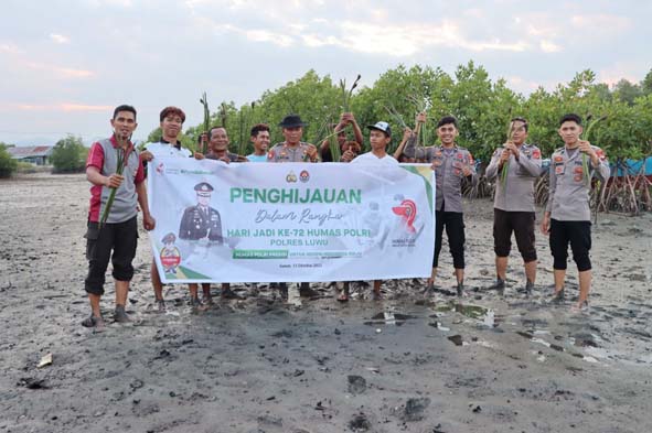 TNO, BELOPA LUWU – Dalam rangka menyambut Hari Ulang Tahun (HUT) Humas Polri Ke-72 Tahun 2023, Polres Luwu melaksanakan penanaman Bibit Pohon Mangrove di Pantai Pesisir Ulo-Ulo Dusun Kambuno Desa Belopa Kec Belopa Kab Luwu, (13/10/2023).