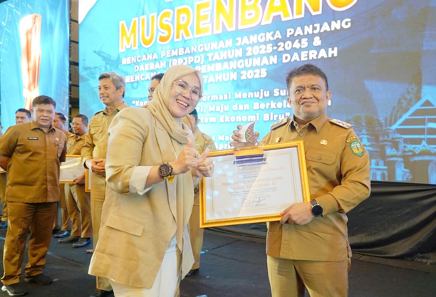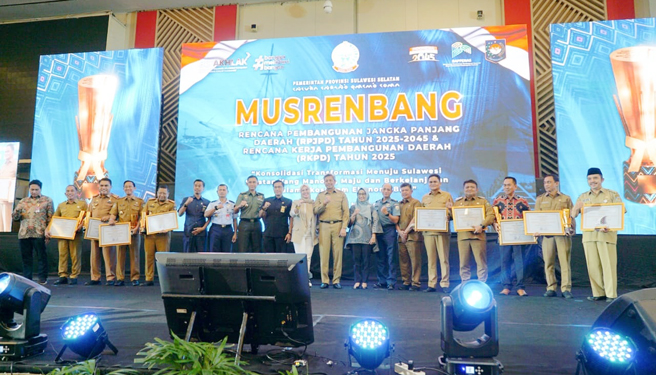 Piagam penghargaan diserahkan pada kegiatan Musyawarah Rencana Pembangunan (Musrenbang) Rencana Pembangunan Jangka Panjang Daerah (RKPD) Tahun 2025-2045 & Rencana Kerja Pembangunan Daerah (RKPD) Tahun 2025 yang berlangsung di Claro Hotel Makassar. Selasa, 30 April 2024.