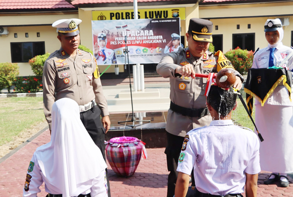 Prosesi penerimaan calon anggota PKS Polres Luwu diawali pengucapan Hasta Prasetya PKS dan Janji Siswa oleh perwakilan calon anggota PKS dan diikuti oleh semua calon anggota PKS Polres Luwu dilanjutkan penyiraman bagi calon anggota PKS kepada 11 perwakilan dari SMA Sederajat di Kabupaten Luwu.