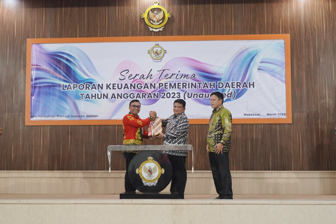 TNO, MAKASSAR SULSEL – Penjabat (Pj) Bupati Luwu, Drs. Muh. Saleh, M.Si, menyerahkan Laporan Keuangan Pemerintah Daerah (LKPD) (Unaudited) TA. 2023 kepada Badan Pemeriksa Keuangan (BPK) RI Perwakilan Provinsi Sulawesi Selatan (Sulsel), yang berlangsung di Kantor BPK RI Perwakilan Sulsel, Makassar, Kamis, 28 Maret 2024.