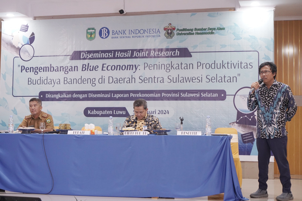 Sementara itu, kepala Puslitbang SDA UNHAS, Prof. Dr. Abdul Rasyid dalam pemaparannya mengatakan, Sulawesi Selatan memiliki potensi perikanan yang tinggi dengan luas perairan 43 juta hektar. Salah satu komoditas perikanan dengan potensi terbesar adalah ikan bandeng yang produksinya tertinggi di Indonesia. Namun, ikan bandeng sering menjadi pendorong inflasi di Sulawesi Selatan karena budidayanya yang kerap terkendala ketersediaan benih dan alih fungsi lahan tambak untuk budidaya Udang Vaname.