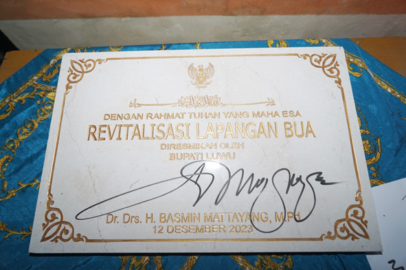 Jum’at malam 19 Januari 2024, Basmin Mattayang, didampingi Kapolres Luwu AKBP. Arisandi, dan Kepala OPD lingkup Pemerintah Kabupaten Luwu menandatangani Prasasti sebagai simbol diresmikannya pemanfaatan pedestarian dan lapangan Andi Maradang Kecamatan Bua.