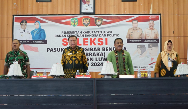 TNO, BELOPA LUWU – Sekretaris Daerah Kabupaten Luwu, Drs. Sulaiman, MM, secara resmi membuka seleksi calon Pasukan Pengibar Bendera Pusaka (Paskibraka) tingkat Kabupaten Luwu tahun 2024 di Ruang Pola Andi Kambo Kantor Bupati Luwu, Kamis, 07 Maret 2024.