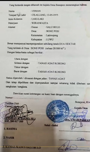 Lanjut Usman, “Jauh sebelumnya saya dan keluarga telah melakukan konfirmasi secara lisan ke Kades Boneposi dan Camat Latimojong, bahkan ke pihak Masmindo, bahwa di Desa Boneposi, khususnya di Dusun Salubulo, ada lahan milik iyye’ku dan saya. Pak Camat Latimojong (Supriadi-red) waktu ditanyakan oleh keluarga, sempat dia bilang banyak SKT palsu (jawab kilas Supriadi),” kutip Usman.