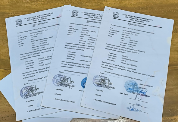 Diketahui SKT yang dimiliki Alm dan keluarga terbit pada (01/03/2001) silam yang ditandatangani oleh Camat Latimojong, Hasman R. Djano, SE., Kepala Desa Boneposi, Drs. Umar Pabeangi dan para saksi, Rasima, Nasir dan Kamal (Kadus Salubulo).